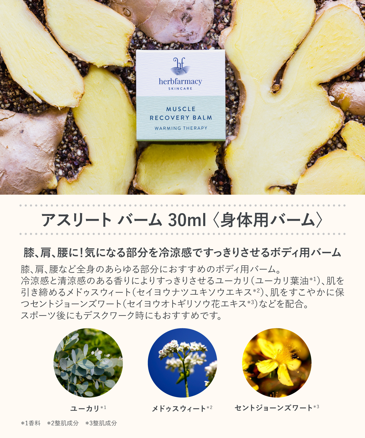 ハイブリッドヒマワリ油・ホホバ種子油・ミツロウ・シア脂・セイヨウオトギリソウ花エキス・コンフリー葉エキス・コンフリー根エキス・セイヨウナツユキソウエキス・ローズマリー葉エキス・コショウ果実油・ローズマリー葉油・ユーカリ葉油・ラベンダー油・ショウガ根油