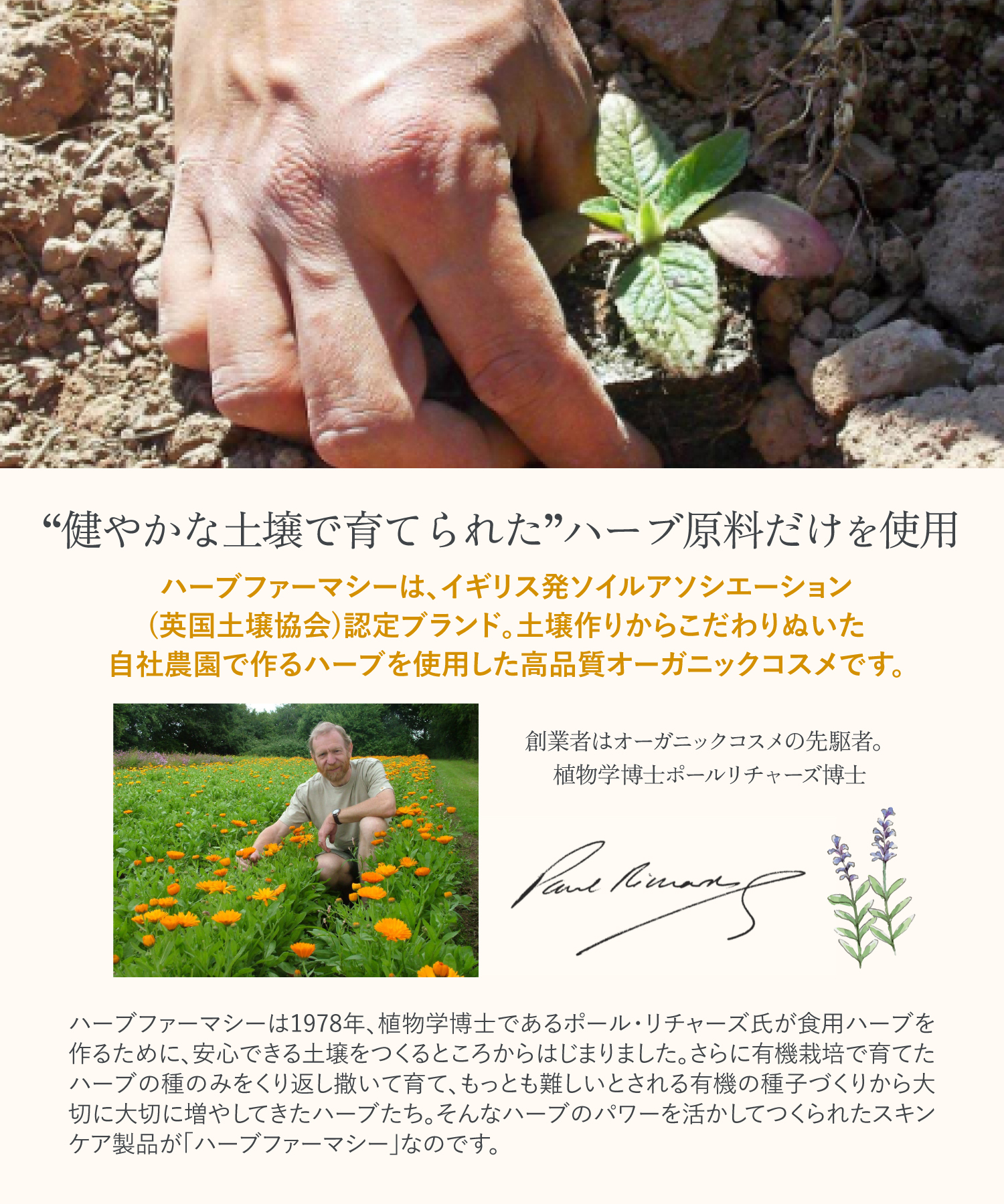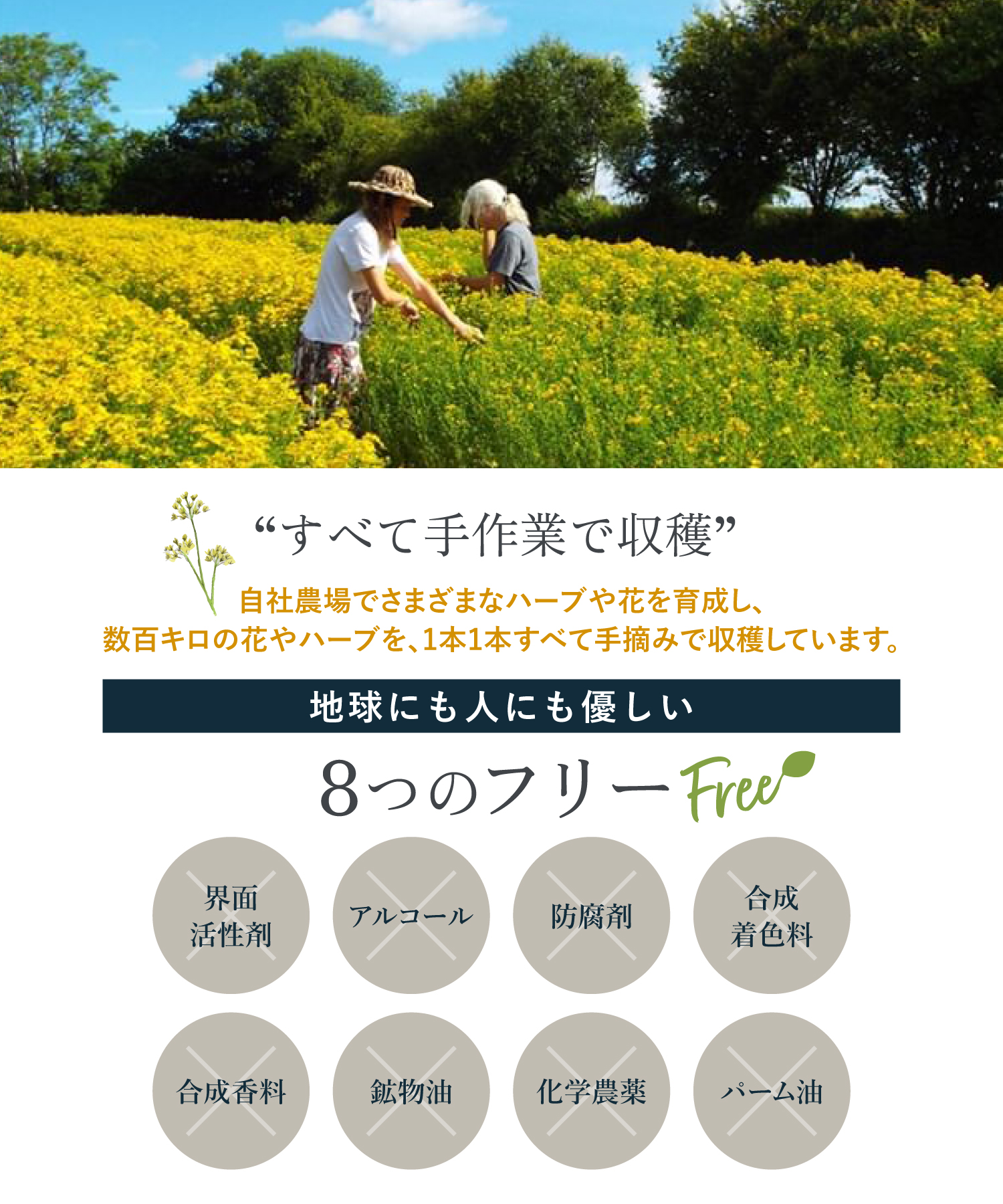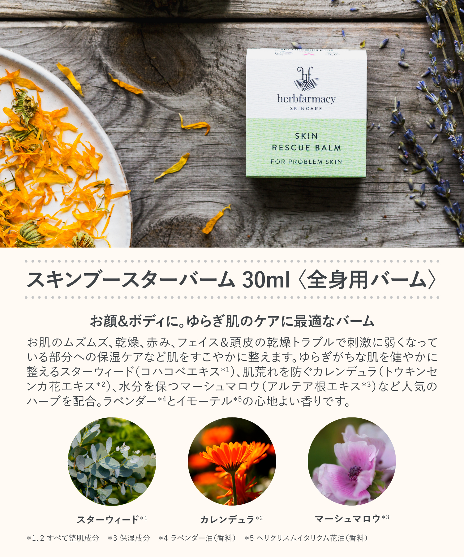肌をすこやかに整えるスターウィード(コハコベエキス)、肌荒れを防ぐカレンデュラ(トウキンセンカ花エキス)、肌に潤いを与えるマーシュマロウ(アルテア根エキス)など人気のハーブを配合。