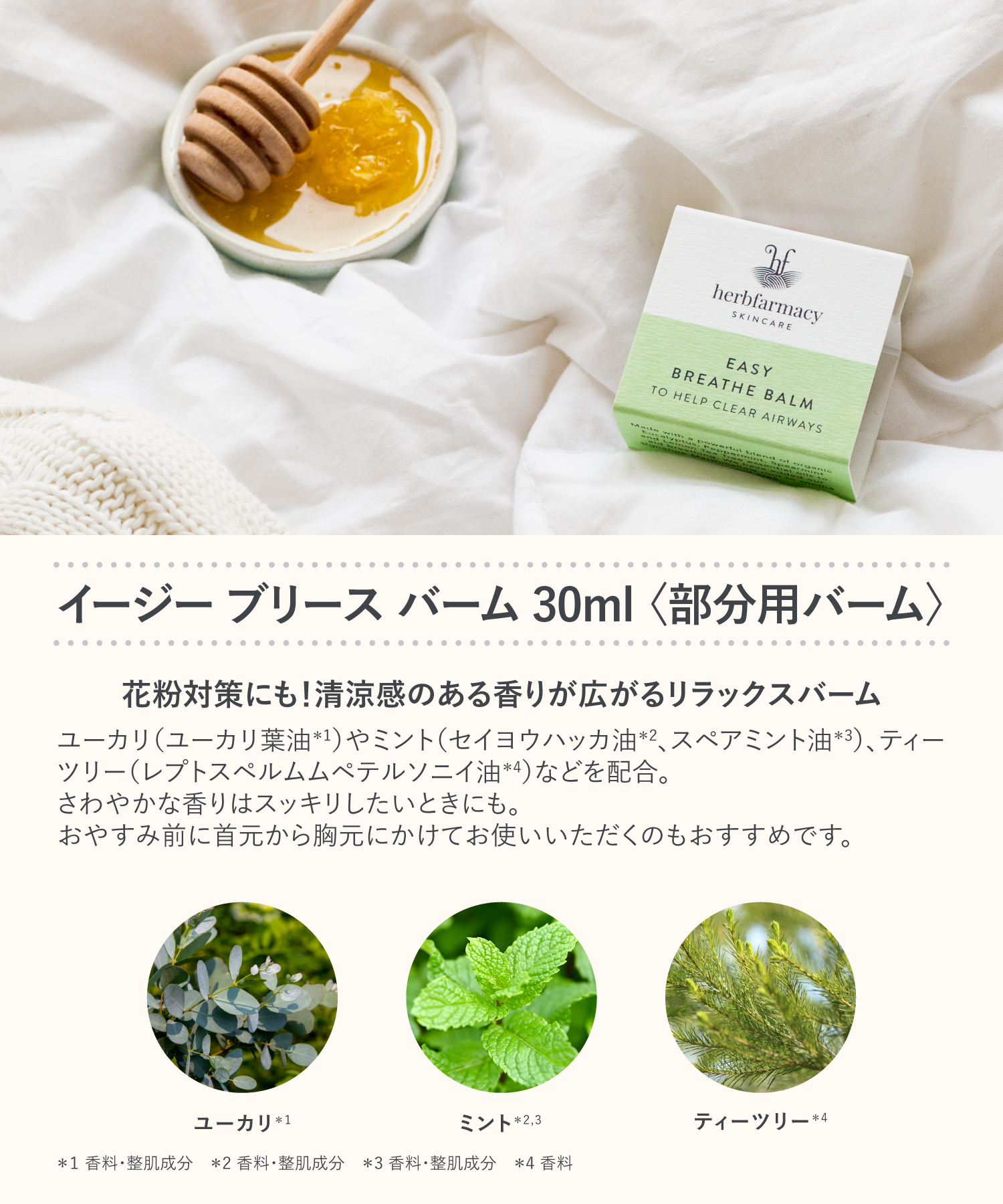 ハイブリッドヒマワリ油・ミツロウ・ユーカリ葉油・セイヨウハッカ油・スペアミント油・レプトスペルムムペテルソニイ油・アルテア根エキス・ローズマリー葉エキス