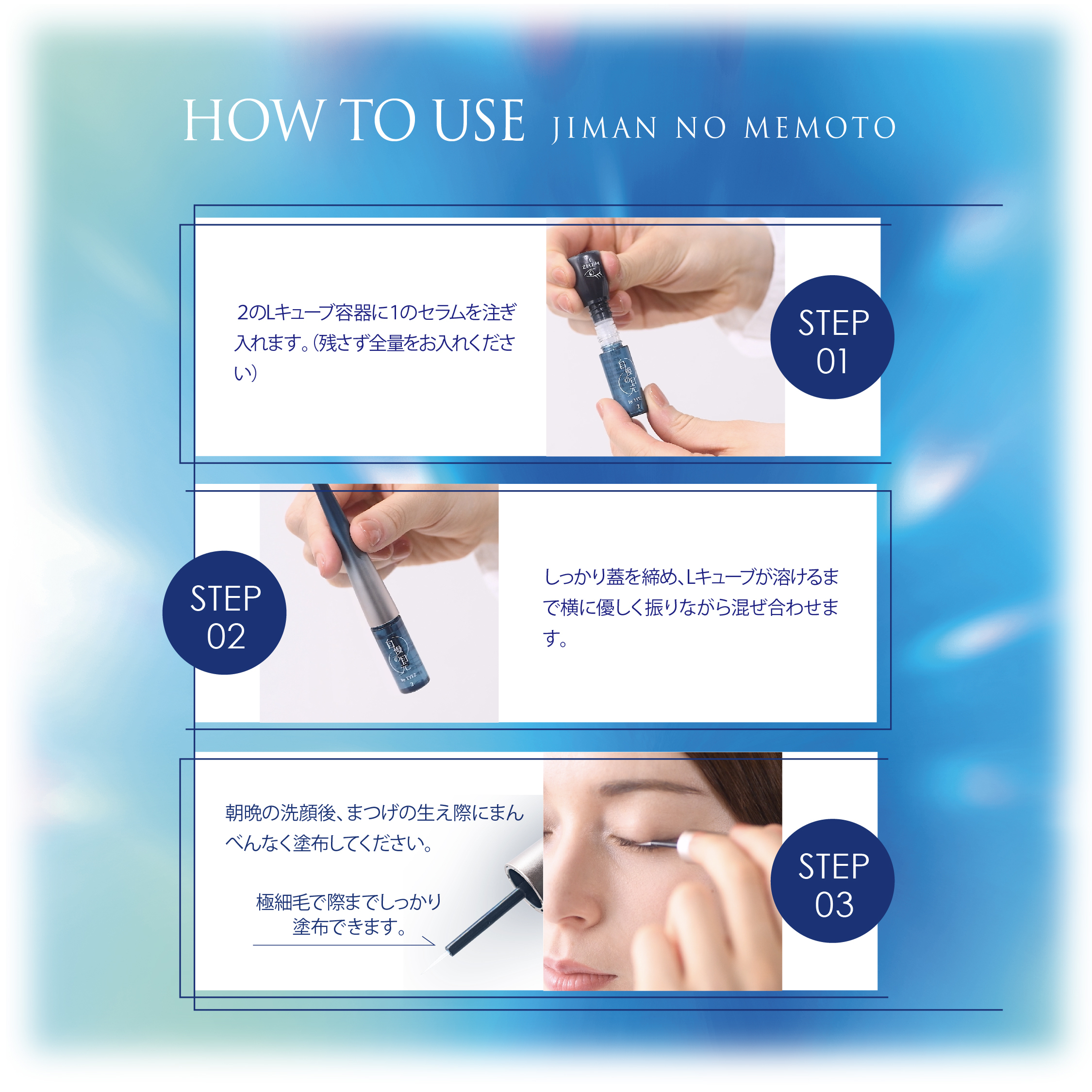 目に入らないよう注意しながら、まつ毛の根元部分(生え際の皮膚の部分)からまつ毛に向けて適量を塗布します。